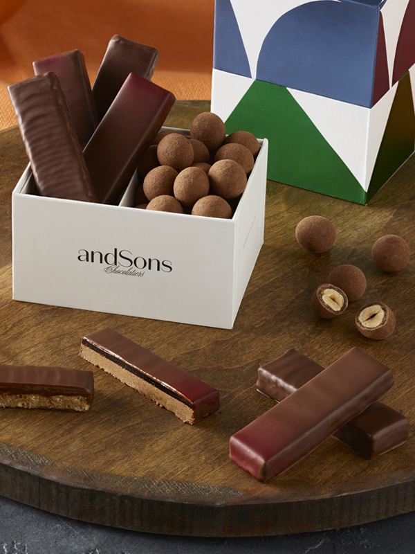 Our reimagining of the classic Fig Newton features a honey-sweet jam made with 2 types of figs from Country Rhodes Family Farm (Central California) which we layer over a hazelnut almond sablé and enrobe in dark chocolate.