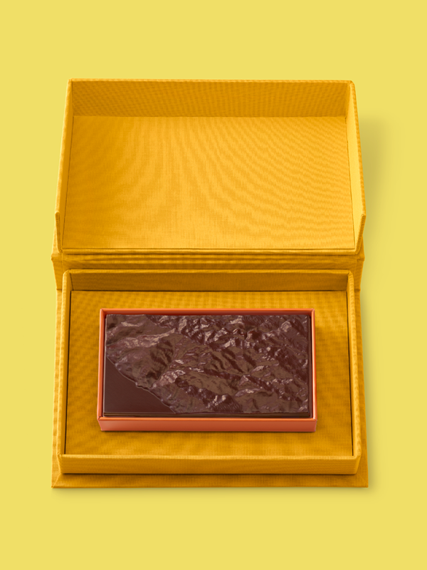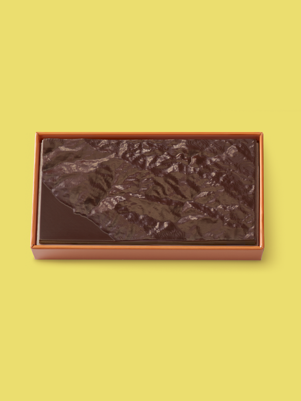 Housed in a cloth-bound box featuring a reproduction of Ruscha's 1971 lithograph “Made in California,” a chocolate bar bears the relief of the West Coast’s rugged topography from the Pacific Ocean eastward to the Santa Lucia Mountains.